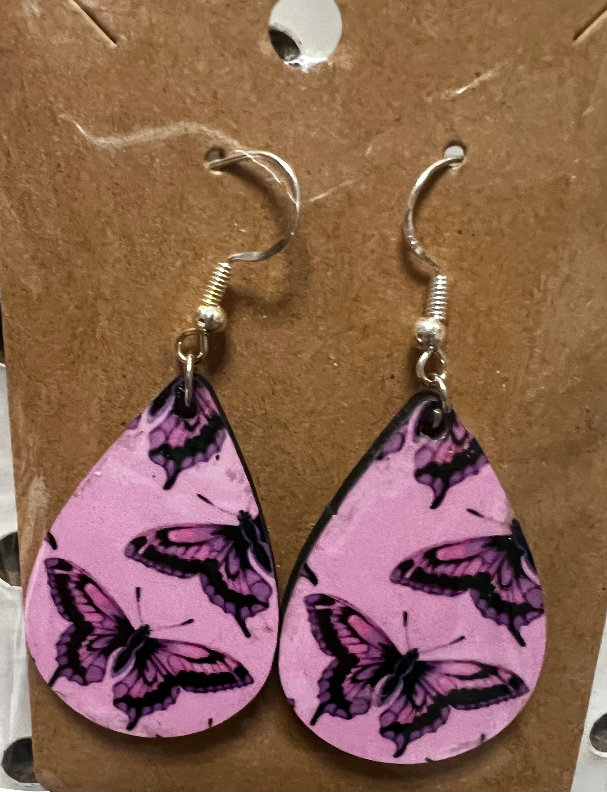 Pink and Black Butterflies Tear Drop Earrings. Sublimation. Hanging. 1 1/2" Length.